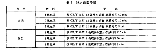 防水包裝等級(jí)分為A類1級(jí)包裝、2級(jí)包裝、3級(jí)包裝和B類1級(jí)包裝、2級(jí)包裝、3級(jí)包裝,詳見(jiàn)表1.